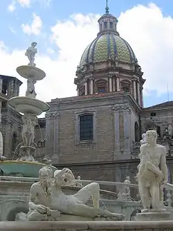 Piazza Pretoria w Palermo. Fontanna (z około 1554 roku), dzieło Francesco Camilliani, jest jedynym przykładem sztuki Cinquecento w mieście. Dominuje nad nią kościół św. Katarzyny (z około 1556 roku) i jego kopuła barokowa z późniejszego okresu.