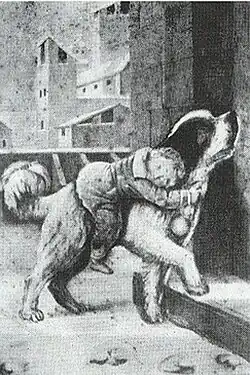 Pomnik przedstawia go z trzymającym się jego obroży dzieckiem na grzbiecie, napis na nagrobku zaś głosi: