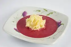 Barszcz gotowany na rosole, mięsie lub wywarze warzywnym, z młodych buraków i liści gotowanych do miękkości, zaprawiany śmietaną i mąką gryczaną. Barszcz tradycyjnie podawany jest na jednym talerzu z oddzielnie ugotowanymi ziemniakami, tłuczonymi, polanymi skwarkami ze słoniny, przyprawiany szczypiorkiem, koprem, cukrem oraz sokiem z cytryny[3].