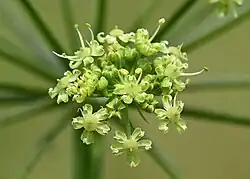- Skupione w baldaszki a te, w liczbie od 10 do 20, w baldachy złożone. Szypuły baldachu mają nierówną długość i są owłosione. Pokryw brak, a pokrywki są liczne, równowąskie, ale szybko odpadają. Kwiaty promieniste, o płatkach żółtozielonawych, brzeżne płatki na skraju baldaszka słabo lub wcale niepowiększone. Płatki są słabo wycięte[5], co najwyżej do 1/3 długości[4]. Zalążnia jest naga lub pokryta nielicznymi, szczecinkowatymi włoskami[5].