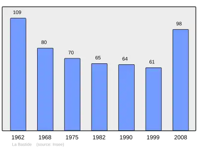 Według danych na rok 1990 gminę zamieszkiwały 64 osoby, a gęstość zaludnienia wynosiła 4 osoby/km² (wśród 1545 gmin Langwedocji-Roussillon Bastide plasuje się na 837. miejscu pod względem liczby ludności, natomiast pod względem powierzchni na miejscu 497.).