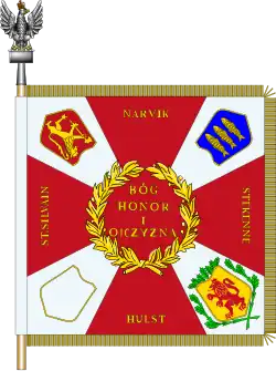 Strona lewa: Na tarczach: herb Norwegii, herb miasta Stekene i herb miasta Hulst. Jedno miejsce pozostawiono na herb miasta St. Sylvain. Na czerwonym tle nazwy miejsc walk batalionu.