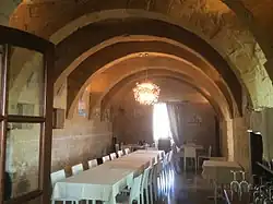 Wnętrze restauracji z otworami strzelniczymi dla muszkieterów wykorzystanymi jako małe okna.