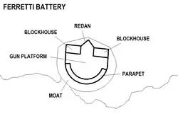 ![]() Widok baterii Ferretti od strony lądu; widoczne blokhauzy i redan | |