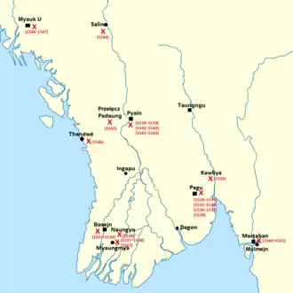 | Martaban (Północna część wybrzeża Taninthayi) | Smim Htaw | Brat przyrodni króla Takayutpiego; zbuntowany od stycznia 1550 r.; w maju zdobył Martaban |