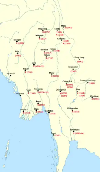 Dwa miesiące po zamachu na Tabinshwehtiego Bayinnaung był gotów do rozpoczęcia realizacji projektu odbudowy imperium. Musiał w tym celu zmierzyć się następującymi przeciwnikami[32]: