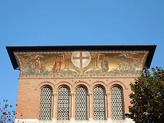 Fasada kościoła nad portykiem ma arkadę pięciu dużych okien oddzielonych małymi kolumnami korynckimi, wspierającymi archiwolty. Pod linią dachu znajduje się gzyms ozdobiony mozaiką zaprojektowaną przez Biagio Biagetti. Pośrodku mozaiki umieszczono krzyż w chwale, w otoczeniu rzymskich żołnierzy, aniołów, czcicieli oraz owiec[2].