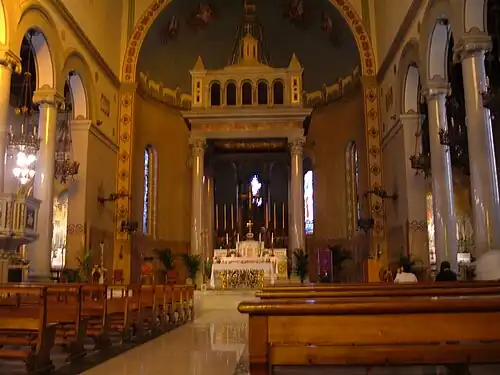 Wolnostojący ołtarz główny ustawiono pod cyborium o czterech kolumnach korynckich podtrzymujących kwadratowe belkowanie z białego marmuru z czerwonym marmurowym fryzem. Powyżej znajduje się arkada z pięcioma małymi łukami z każdej strony i centralna latarnia[2].