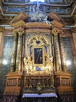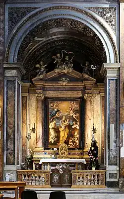 Apsydę flankują dwa marmurowe posągi aniołów dłuta Giovanni Lorenzo Berniniego, które początkowo przeznaczone były do ozdobienia mostu św. Anioła[3]. Anioł po lewej trzyma koronę cierniową, a po prawej Titulus Crucis.