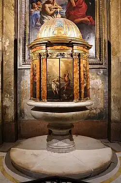 Kaplica w rogu po prawej stronie wejścia jest poświęcona św. Janowi Chrzcicielowi i pełni rolę baptysterium. Na ścianie wisi Chrzest Chrystusa autorstwa Ludovico Gimignani oraz obraz Marcantonio Belladonna po prawej stronie i Domenico Jacovacci po lewej. Drewniana pokrywa chrzcielnicy ma kształt tempietto, została ozdobiona malowidłami przez Jacques Courtois w 1674 roku[2].