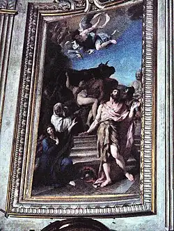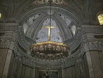 Powierzchnie sklepienia są zdobione sztukateriami na złoconym tle. Na skrzyżowaniu transeptu i nawy jest płytka eliptyczna kopuła z centralnie umieszczoną Gołębicą Ducha Świętego, pendentywy pocięte są łukami nad oknami ustawionymi po przekątnej. W częściach pendentywów od strony kopuły umieszczono symbole Chi Rho[3].