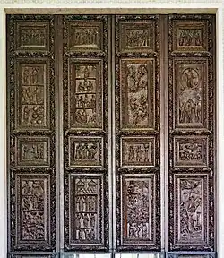 Drzwi portalu głównego wykonane są z cyprysowego[4] drewna, przy czym są to oryginalne drzwi świątyni datowane pomiędzy 420 a 450 rokiem[2]. Drzwi te pierwotnie zdobiło 28 płaskorzeźbionych kwater przedstawiających sceny biblijne, do czasów obecnych zachowało się 18 z nich[3]. Kolejne kwatery przedstawiają (idąc od góry do dołu i od lewej do prawej): ukrzyżowanie, niewiasty przy pustym grobie, pokłon trzech króli, Chrystusa ze św. Piotrem i Pawłem, wskrzeszenie Łazarza, Mojżesza na pustyni, wniebowstąpienie, powtórne przyjście (lub triumf) Chrystusa, ukazanie się Jezusa po zmartwychwstaniu uczniom, ukazanie się Jezusa po zmartwychwstaniu niewiastom, zapowiedź zaparcia się św. Piotra, proroka Habakukaa z aniołem, Mojżesza otrzymującego prawo, hołd składany ważnej osobistości, Izraelitów ze słupem ognia, Eliasza wstępującego do nieba, św. Piotra myjącego ręce, Chrystusa przed Kajfaszem[2]. Scena ukrzyżowania na drzwiach jest prawdopodobnie jednym z najstarszych przykładów takiego przedstawienia w sztuce[3][2].