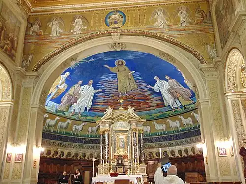 Mozaika na łuku tęczowym była częścią tego samego schematu ideologicznego co mozaika absydy, ale mogła ona zostać ukończona w późniejszych czasach, za papieża Sergiusza I pod koniec VII wieku. Kompozycja nawiązuje do pierwszych rozdziałów Apokalipsy św. Jana. Centralnie umieszczono Baranka Bożego na tronie z krzyżem powyżej i zwojem z siedmioma pieczęciami poniżej. Baranka otacza siedem świeczników oraz czterech aniołów. W górnych rogach znajdują się symbole Ewangelistów – w lewym uskrzydlony człowiek reprezentujący św. Mateusza, a po prawej orzeł – św. Jana. Nad pilastrami widać ramiona wyciągające się w kierunku Baranka. Należały one do starców z Apokalipsy, których postacie zostały zniszczone podczas renowacji bazyliki w XVII wieku (podobnie jak symbole pozostałych dwóch Ewangelistów)[2].