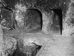 W drugim typie grobowców (B) wzdłuż lewej i prawej ściany komory grobowej wyciosywano po jednej niszy (arcosolium) z łukowym obramowaniem[14][25]. Grób mógł mieć formę skalnej półki, ale czasem dno wnęki było wykuwane dość głęboko, tak że arcosolium przybierało kształt sarkofagu lub kamiennej trumny, na krawędzi której możliwe było ułożenie poziomej płyty, za pomocą której można było całkowicie zamknąć grób[16]. Trzecia, mniejsza nisza na wprost wejścia mogła być wykorzystana do złożenia ciała dziecka lub ustawienia w niej lampy[27]. Od końca I wieku p.n.e.[26][20] sklepienie wnęki było często wykuwane w formie łuku. Ten typ grobowców znany jest z Grobów Królewskich w Jerozolimie. Były one zarezerwowane dla osób zamożnych i wyróżnionych[27]. Budowanie grobowca o jednym miejscu stanowiło zdecydowany wyjątek[28][29]. Wejście do westybulu tego typu grobowca było zwykle zamykane spłaszczonym kamieniem w kształcie późniejszego żarna, umieszczonym w prowadnicy wykutej w skale[14][30]. Taki sposób zamknięcia był jednak stosowany jedynie w grobowcach tego rodzaju. Jeszcze przed narodzeniem Jezusa na terenie Jerozolimy rozpowszechnił się zwyczaj, by po jakimś czasie szczątki trafiały do ossuarium. Zwyczaj ten panował aż do upadku Świątyni lub nieco dłużej[14][25].