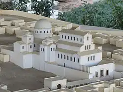 Do głównej, pięcionawowej bazyliki Martyrium, której absyda była zorientowana na zachód, wchodziło się od wschodu z głównej ulicy miasta (cardo)[50]. Między cardo a bazyliką zaprojektowano atrium „o wielkiej powierzchni, z wolnym widokiem na niebo”[35], ozdobione „posadzkami z kamieni wypolerowanych do połysku i z trzech stron otoczony bardzo długimi portykami”[35]. Z atrium do bazyliki wiodły trzy portale[6].