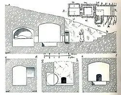B: 1 – westybul; 2 – komora grobowa; 3 – arcosolium