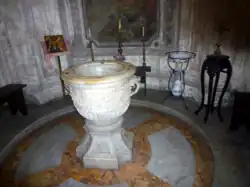 Pierwsza kaplica po lewej stronie została wyposażona przez kardynała Annibale Albani w 1727 roku. Znajduje się w niej chrzcielnica[2].