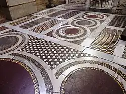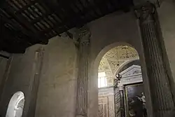 W ściany kościoła wmurowane są starożytne kolumny, będące pozostałościami dawniejszej budowli stojącej na tym miejscu, dwie z tych kolumn są przy wejściu. Po obu stronach wejścia znajdują się duże czarne granitowe kamienie, będące starożytnymi wzorcami wagowymi. Podłoga bazyliki zdobiona jest cosmatesco[2].