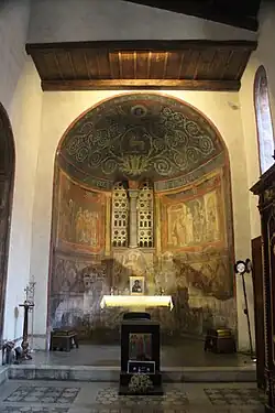 W centralnej części apsydy znajduje się para okien z transennami. Pod tymi oknami stoi XII-wieczne krzesło biskupie wykonane z marmuru. Jego podłokietniki zostały wrzeźbione w kształcie lwów, natomiast w górnej części oparcia umieszczono kółko cosmatesco z porfirowym dyskiem. Ściany apsydy zdobią XIX-wieczne freski w stylu średniowiecznym, przedstawiają one Zwiastowanie, Narodzenie Pańskie i Objawienie Pańskie, a natomiast koncha zawiera wizerunek Matki Bożej z Dzieciątkiem w otoczeniu świętych Augustyna, Feliksa, Dionizego i Mikołaja[2].