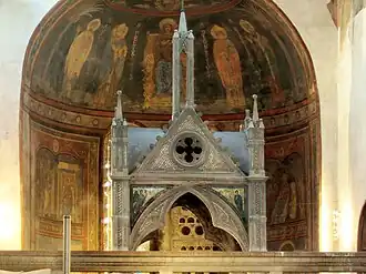 Nad ołtarzem głównym umieszczono baldachim z dekoracją cosmatesco, który jest sygnowany Deodatus me fecit i datowany na 1294 rok. Ma on cztery kolumny z czerwonego granitu. Sam ołtarz zrobiono ze starożytnego granitowego zbiornika w kształcie wanny. Napis dedykacyjny ołtarza brzmi: Anno D. MCXXIII Ind. I. dedicatum fuit hoc altare per manus Dni. Calixti Papae Secundi V sui pontif. Anno M Maio die VI, Alfano Camerarius plurima dona largiente[2].