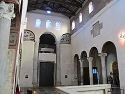 Kościół ma trzy nawy. Nawa główna jest oddzielona od naw bocznych przez arkady zawierające po 9 kolumn z każdej strony. Kolumny te nie stanowią jednolitego kompletu i mają różne kapitele (są to tzw. spolia). W górnej części ścian bocznych nawy głównej znajdują się niewielkie okna. Również w górnej części bazyliki można zobaczyć pozostałości fresków[2].