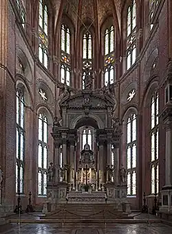 Prezbiterium zamyka dwukondygnacyjna, wieloboczna apsyda, której ściany przepruto wysokimi, ostrołukowymi biforiami. Nad oknami części dolnej umieszczono rozety. Kondygnacje przedziela gzyms ozdobiony fryzem oraz balustrada[2]. Po obu stronach prezbiterium, przy ramionach transeptu, znajdują się mniejsze apsydy, po dwie z każdej strony[5].