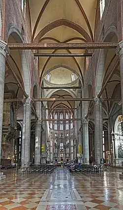 Bazylika została zbudowana na planie krzyża łacińskiego, jako założenie trzynawowe, z transeptem[5]. Ma 96 m długości i 40 szerokości[12]. Nawy zostały przekryte sklepieniem krzyżowym, wspartym na potężnych filarach, pomiędzy którymi umieszczono charakterystyczne, drewniane belki[2]. Dobrze oświetlone światłem dziennym prezbiterium zwraca uwagę swoimi gotyckimi oknami i barokowym ołtarzem, przypisywanym Longhenie. Witraż jest jednym z nielicznych zachowanych z okresu, kiedy były one produkowane na Murano, głównie przez Bartolomea Vivariniego[6].