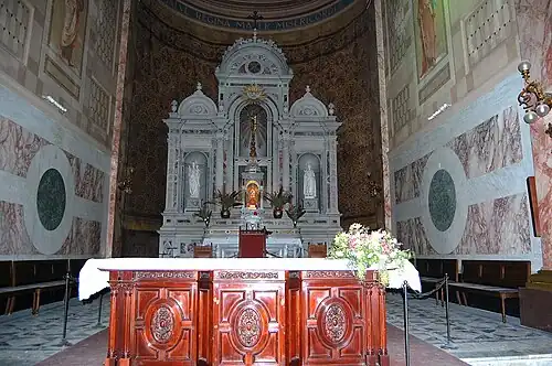 Ołtarz główny z marmuru karraryjskiego został wykonany w Genui i zainstalowany w bazylice w 1898 roku.[4] W centralnej części ołtarza znajduje się figura Matki Bożej Trzydziestu Trzech, powyżej niej krucyfiks, po bokach po lewej rzeźba przedstawiająca św. Józefa, a po prawej św. Ferdynanda.