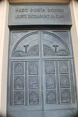 Drzwi bazyliki wykonane są z brązu, ważą ok. 800 kg.[4] Zostały ozdobione reliefami przedstawiającymi sceny biblijne i historyczne (m.in. pierwsi mieszkańcy Pintado, budowa pierwszej kaplicy w Pintado, przeniesienie wizerunku Matki Bożej z Pintado do Villa de la Florida, pierwsza msza ofiarowana za ojczyznę w 1811 roku, Trzydziestu Trzech przed Matką Bożą, zgromadzenie z 1825 roku, pierwsi misjonarze ewangelizujący rdzenną ludność, bitwa pod Las Piedras, wygnanie franciszkanów z miasta Montevideo w 1811 roku, założenie pierwszej biblioteki publicznej, zaprzysiężenie konstytucji na krzyżu utworzonym przez miecz i bagnet).[4]