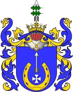 Opis zgodnie z klasycznymi regułami blazonowania: W polu błękitnym podkowa złota barkiem w dół, w niej krzyż kawalerski srebrny, a nad nim strzała grotem w górę tej samej barwy. W klejnocie nad hełmem w koronie takaż strzała, a w poprzek dwa listki dębowe.