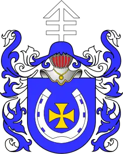 W polu błękitnym podkowa srebrna barkiem w dół, w niej krzyż kawalerski złoty. W klejnocie nad hełmem bez korony rogacina podwójnie przekrzyżowana.