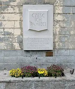 W latach 50. XX wieku na frontowej ścianie kamienicy zainstalowano tablicę projektu Karola Tchorka. Wyryty na niej napis informuje niezbyt ściśle[27][28]: