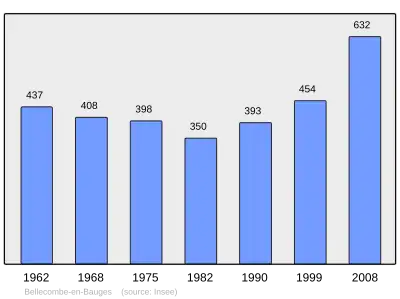Według danych na rok 1990 gminę zamieszkiwały 393 osoby, a gęstość zaludnienia wynosiła 17 osób/km² (wśród 2880 gmin regionu Rodan-Alpy Bellecombe-en-Bauges plasuje się na 1240. miejscu pod względem liczby ludności, natomiast pod względem powierzchni na miejscu 388.).