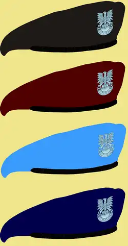 Berety czarne noszono zamiast czapki polowej, natomiast berety bordowe i niebieskie, także zamiast czapki garnizonowej[19]. Oznaki stopni wojskowych noszono jedynie na berecie bordowym i niebieskim[22].