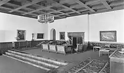 „(...) Za przestronnym przejściem z półkolistym łukiem dawnego domu Wachenfeld, z zawieszonymi ciężkimi aksamitnymi portierami w kolorze bordo, znajdowały się szerokie drewniane schody wiodące do Wielkiej Sali. (...) Miała ona 200 metrów kwadratowych powierzchni i była bardzo wysoka. Podłoga wyłożona była welurem w kolorze poziomkowym, a trzy marmurowe schodki wiodły przed kominek, do znajdujących się tam miejsc do siedzenia. Stało tu niewiele mebli – tylko dwie wielkie szafy, siedzenia po prawej stronie okna, ogromny stół do obrad, globus i po lewej stronie stojący zegar, a poza tym pianino i liczne komódki. Jedna z wielkich szaf miała uchwyty w kształcie męskich głów. Zawierała ona dokumenty nadania obywatelstwa honorowego, starą broń i tym podobne. Druga szafa mieściła za szklanymi szybami stare zastawy z cyny. Wspaniałe gobeliny z pełnymi życia scenami myśliwskimi przykrywały otwory w ścianie, konieczne dla prowadzenia pokazów filmowych. (...) Największe wrażenie w Wielkiej Sali, z jej ciemnobrązowym kasetonowym stropem, robiło w ciągu dnia niezwykłe, jak na ówczesne warunki, duże okno, które można było otworzyć za pomocą korby; ukazywało wtedy majestatyczną górę Untersberg jakby w specjalnych ramach”...[4]