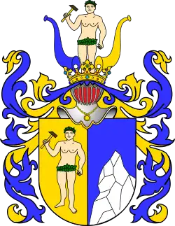 Na tarczy dwudzielnej w słup w polu prawym, złotym dziki mąż bez zarostu w przepasce z liści i wieńcu zielonym, trzymający w uniesionej prawicy młot górniczy. W polu lewym, błękitnym sylwetka góry srebrnej.