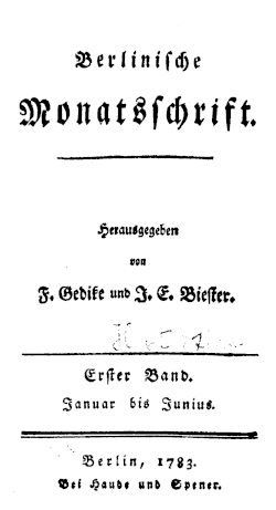 - Berlinische Monatsschrift. Hrsg. von Gedike und Biester. Haude und Spener, Berlin 1.1783 - (ab 1791 von Biester allein) 28.1796.
