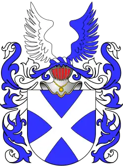 Klejnot: Nad hełmem bez korony, na zwiniętej chuście srebrno-błękitnej dwa skrzydła orle - z prawej srebrne, z lewej błękitne.