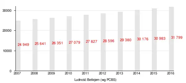 Według danych Palestyńskiego Centralnego Biura Statystycznego w 2016 w Betlejem zamieszkiwało 31 799 mieszkańców[2].