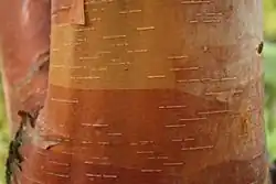 - Kora jest błyszcząca i ma różową, fioletową bądź pomarańczową barwę. Niektóre drzewa mogą mieć białą korę (mogą to być mieszańce)[4].