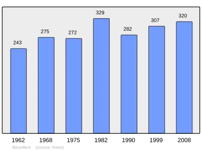 Według danych na rok 1990 gminę zamieszkiwały 282 osoby, a gęstość zaludnienia wynosiła 47 osób/km² (wśród 2335 gmin Lotaryngii Beuvillers plasuje się na 767. miejscu pod względem liczby ludności, natomiast pod względem powierzchni na miejscu 923.).