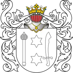 W polu barwy niewiadomej dwie gwiazdy w słup, z prawej buława, z lewej szabla.