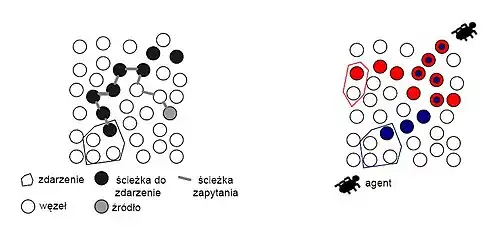 Każdy węzeł sieci ma tablicę sąsiadów oraz zdarzeń, a także informacje o kierunku do innych znanych mu zdarzeń w sieci. Agenty tworzone są w jednym z węzłów rejestrujących to samo zdarzenie. Następnie agent wędruje poprzez losowo wybrane węzły przez określoną wcześniej maksymalną liczbę skoków. Podczas takiej wędrówki wiadomość agencka tworzy własną tablicę zdarzeń odwiedzanych sensorów. Jeśli agent trafia na ścieżkę prowadzącą do innego zdarzenia następuje agregacja tras. Dodatkowo, jeśli agent trafi na węzeł będący częścią ścieżki dłuższej niż mu znana, aktualizuje jego tablicę trasowania, wpisując ścieżkę krótszą.