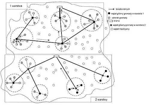 LEACH jest protokołem działającym w oparciu o wyżej wspomniane gromady sensorów. Gromada to grupa sensorów, które łączą się z jednym i tym samym węzłem głównym (cluster head). Powstanie gromady rozpoczyna się od wyboru węzłów głównych obejmujących kilka procent sensorów całej sieci. Pośród innych wykonywanych funkcji węzły główne agregują dane pochodzące ze wszystkich sensorów należących do gromady, po czym wysyłają je do stacji bazowej. Skutkiem tego jest zmniejszenie ilości danych przesyłanych bezpośrednio do stacji bazowej. LEACH wykorzystuje mechanizm CDMA/TDMA w celu zmniejszenia liczby kolizji wewnątrz gromad oraz pomiędzy nimi. Protokół pracuje cyklicznie, a każdy cykl składa się z dwóch faz[12]. Faza pierwsza obejmuje formowanie się gromad oraz wybór węzłów głównych. Każdy węzeł generuje losową liczbę z zakresu 0 do 1. Jeśli liczba okazuje się mniejsza niż progowa wartość T(n), węzeł staje się węzłem głównym gromady. Wartość T(n) obliczana jest w następujący sposób: