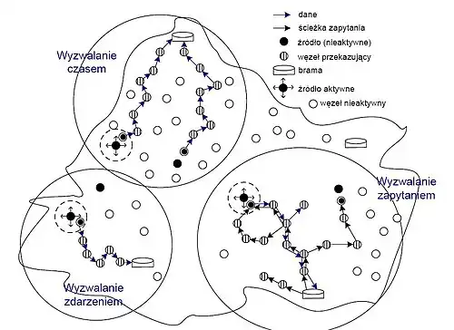 - ewolucja sieci – przyłączanie nowych węzłów, reakcja na zużycie lub uszkodzenie niektórych węzłów, zmiana zadania przydzielonego sieci lub klastrowi, zmiana węzła nadrzędnego.