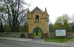 - Ogrodzenie kościoła parafialnego, z końca XVI wieku – mur kamienny, oszkarpowany. Od strony północnej znajduje się w nim bramka, zapewne z końca XVI wieku, murowana, otynkowana z przejazdem zamkniętym półkoliście. Szczyt wydzielony belkowaniem z wydatnym gzymsem, trójkątnym, przerwanym przyczółkiem, lizeną pośrodku oraz 2 stiukowymi rozetami po bokach. Przy murze znajduje się krzyż granitowy, zapewne średniowieczny.