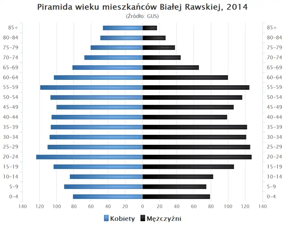 - Piramida wieku mieszkańców Białej Rawskiej w 2014 roku[9].