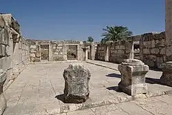 Synagoga została zapewne zbudowana w IV lub V wieku, na miejscu wcześniejszej synagogi. Przypuszcza się, że powstała ona w 460 roku[2], jednak dokładna data jej budowy nie jest znana. Archeolodzy zgodzili się co do tego, że wzniesiono ją kilkaset lat po ukrzyżowaniu Jezusa Chrystusa i z pewnością nie jest to ta sama synagoga, w której modlił się i nauczał Jezus[a][3]. W okresie arabskiego podboju Palestyny, tutejszy kościół i synagoga były zniszczone. Jerome Murphy-O’Connor, irlandzki dominikanin, biblista, teolog katolicki, profesor École Biblique w Jerozolimie twierdzi, że obydwie budowle zostały zniszczone przed podbojem Palestyny przez Umara ibn al-Chattaba. Jego zdaniem prawdopodobna jest wersja wydarzeń, w której Żydzi, bezpośrednio po najeździe z 614 roku zyskali możliwość odwetu za doznane krzywdy i zburzyli kościół, zaś gdy cesarz Herakliusz wyzwolił na krótko Palestynę w 629 roku, chrześcijanie w rewanżu zburzyli synagogę[4].