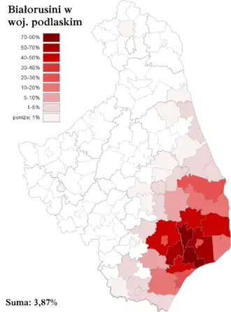 Ze względu na zanik białoruskiej tożsamości w miejscowościach katolickich granice białoruskości w środowiskach wiejskich Białostocczyzny zaczęło wyznaczać wyznanie prawosławne. Działo się to przy tym zupełnie niezależnie od jakichkolwiek układów etnograficznych istniejących w obrębie podlaskich wyznawców tej religii. Etnonim Białorusini jako określenie własnej grupy etnicznej rozpowszechnił się wśród ludności prawosławnej zamieszkałej zarówno na terenach etnograficznie białoruskich (powiat sokólski, augustowski, białostocki, północna część powiatu hajnowskiego), jak i obszarach uważanych przez niektórych badaczy za etnograficznie raczej północnoukraińskie (powiat bielski, powiat siemiatycki, część powiatu hajnowskiego)[37]. Tak właśnie ukształtowaną grupę etniczną ma się zazwyczaj na myśli mówiąc o mniejszości białoruskiej na Białostocczyźnie.