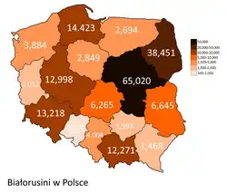 Podczas przeprowadzonego w 2021 roku narodowego spisu powszechnego narodowość białoruską zadeklarowało 56,607 obywateli RP[2], zaś według statystyk migracyjnych z 2024 roku na terenie kraju mieszka 124,343 obywateli Białorusi[3], co daje razem 188,490 mieszkańców Polski białoruskiego pochodzenia.